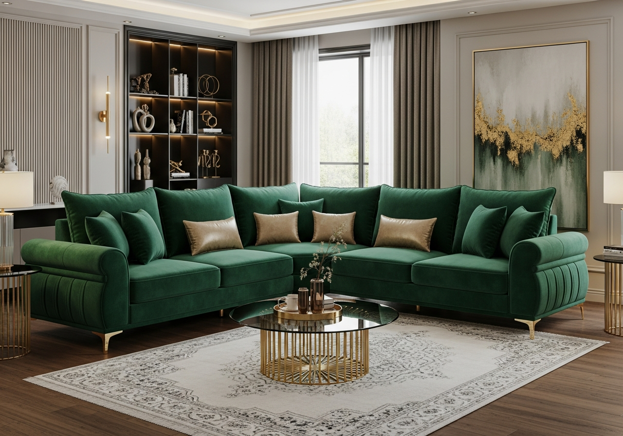 Make a bold statement with this expansive emerald green sectional. Features deep seating, extra-plush back cushions, and a kiln-dried hardwood frame for lasting durability.